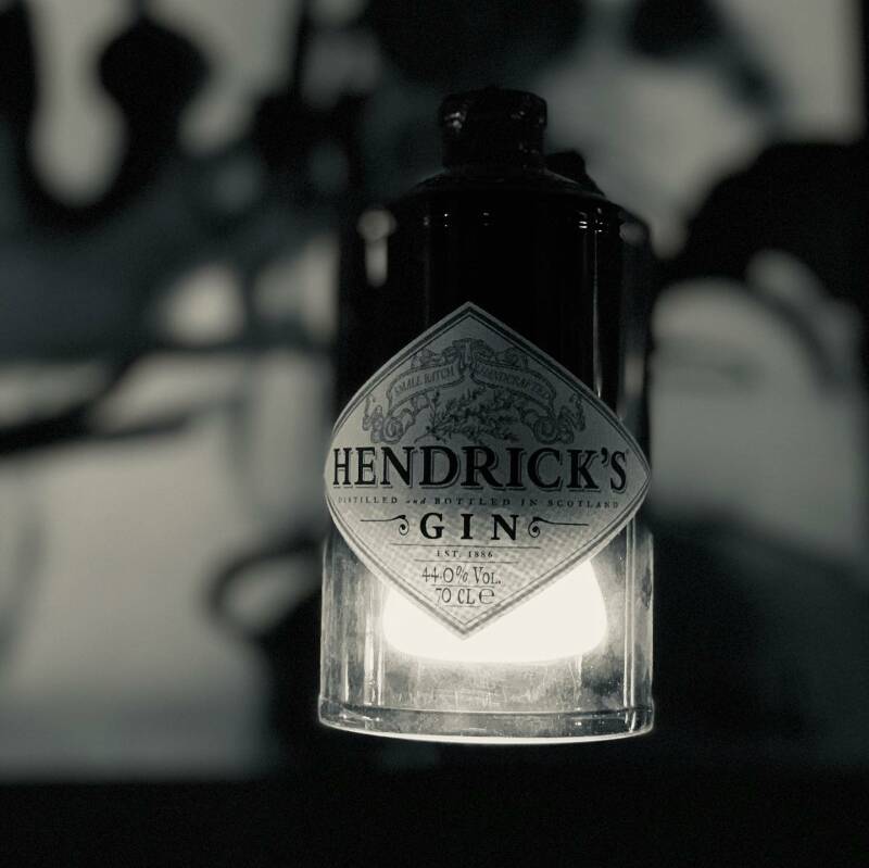 Diese wunderschönen Hendrick's Gin Flaschen beleuchten unsere Bar und vereinzelte Tische und Bereiche im Gastraum.